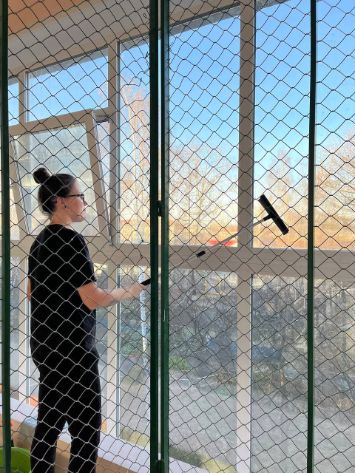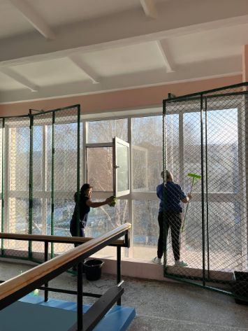 Мыли окна, очень старались. Ведь на них возложена большая ответственность. В это зале занимаются все спортивные детские группы нашего города - и баскетболисты, и футболисты, волейболисты и различные группы борьбы.