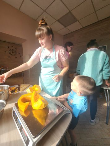 Детки и мамы сразу включилась в работу. Кто-то боролся с тыквой, ведь очистить её и нарезать тот ещё труд. Толстая кожура никак не хотела поддаваться.